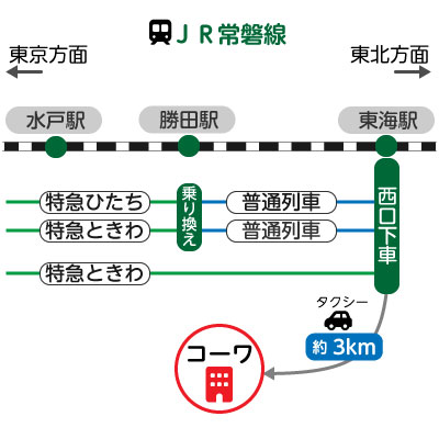 ※特急ときわは「東海駅」に停車する列車をご利用ください。特急ひたちは普通列車への乗り換えが必要となります。